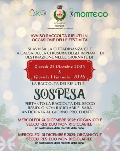 Raccolta dei rifiuti sospesa giovedì 25 dicembre 2025 e giovedì 1 gennaio 2026. Raccolta residuo non riciclabile sarà anticipata al giorno precedente, mercoledì 24 dicembre 2025 e mercoledì 31 dicembre 2025