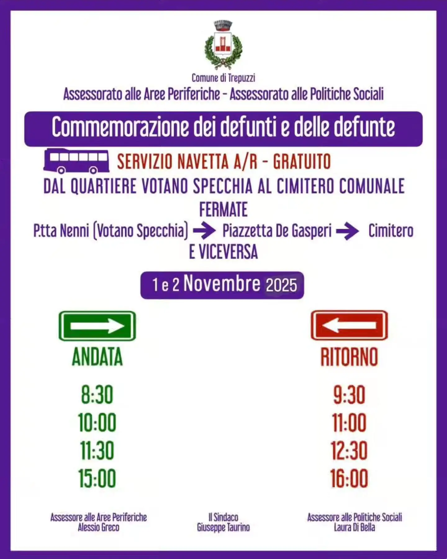 Sin informa la cittadinanza che, è stato attivato il servizio navetta gratuito di andata e ritorno dal Quartiere Votano Specchia al Cimitero comunale con fermata intermedia presso Piazzetta De Gasperi, rivolto a persone anziane e non automunite.