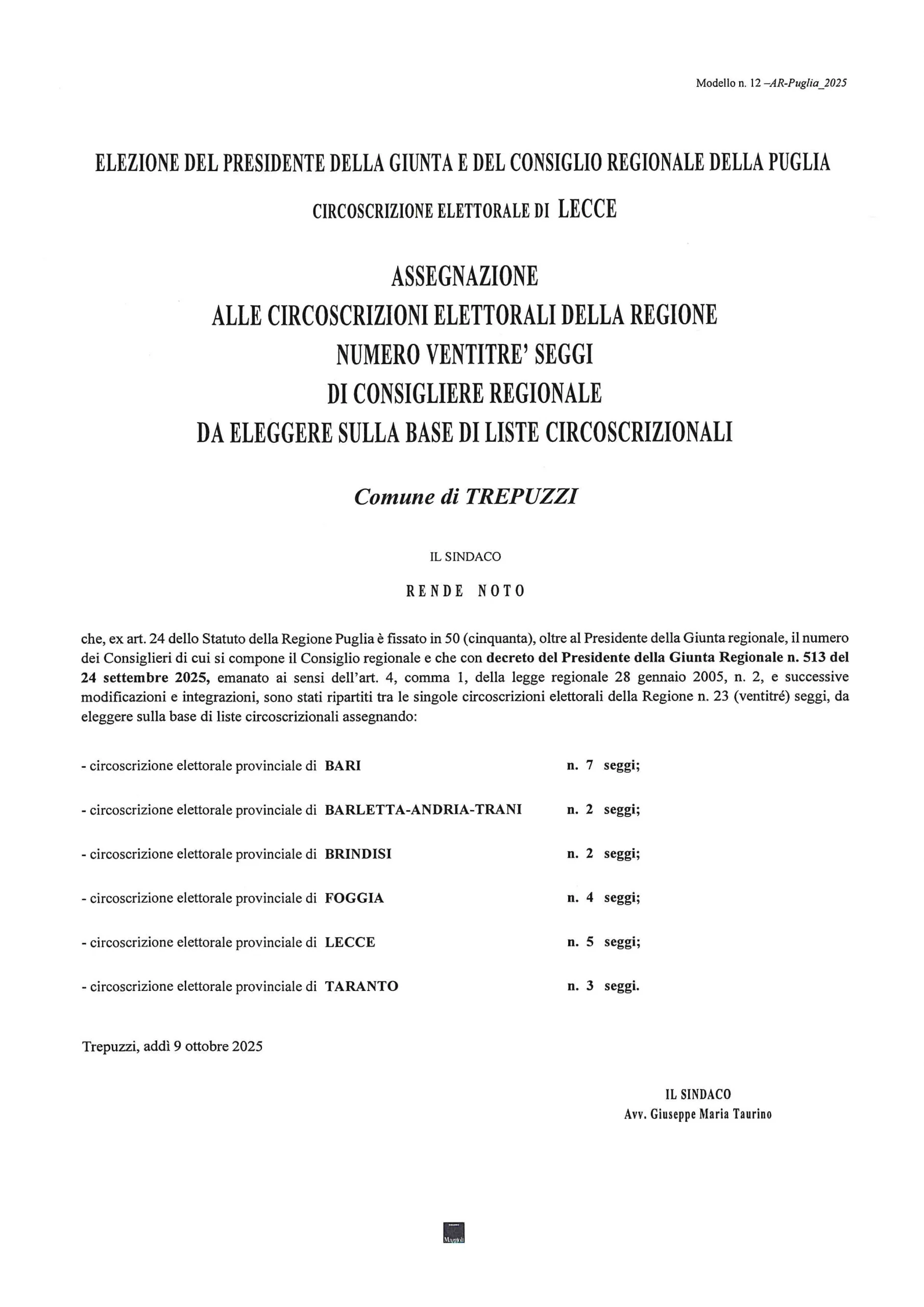 Elezione del Presidente della Giunta e del Consiglio Regionale della Puglia