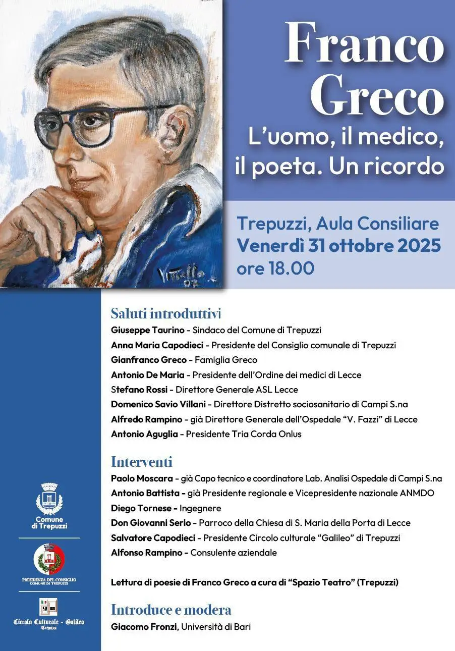 Venerdì 31 ottobre 2025, ore 18.00 in Aula Consiliare, momento di comunità in ricordo del nostro concittadino dott. Franco Greco a pochi mesi dall'improvvisa scomparsa "L'uomo, il medico, il poeta".